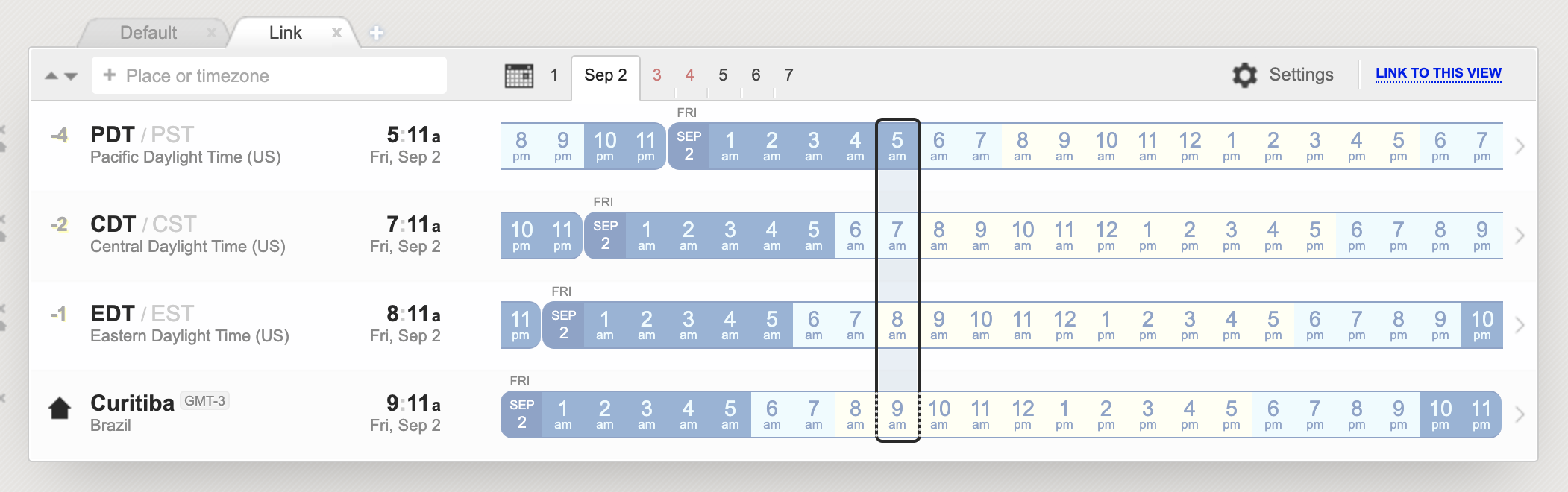 When working in a remote team in differentes timezones, I always end up with problems to do time math. But now I'm using this website that gives me a very nice overview about different timezones that are relavant, with a really helpful overlapping view! They also offer a mobile version.